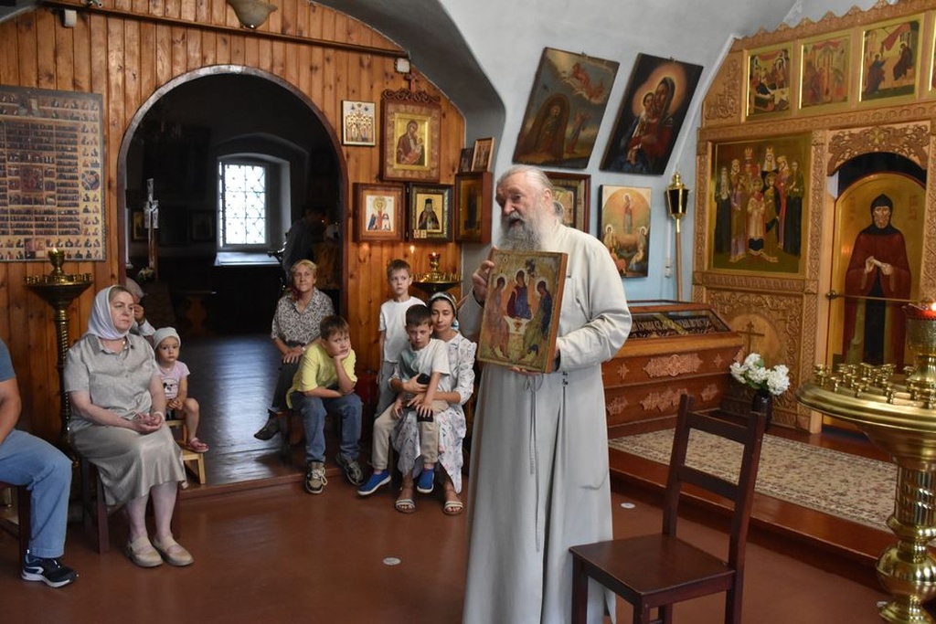 Отец Александр поднял вопросы богословия иконы «Троицы» работы преподобного Андрея Рублева, напомнил ветхозаветные события гостеприимства Авраама, а также затронул житие преподобного и исторические аспекты развития иконографии на Руси.