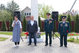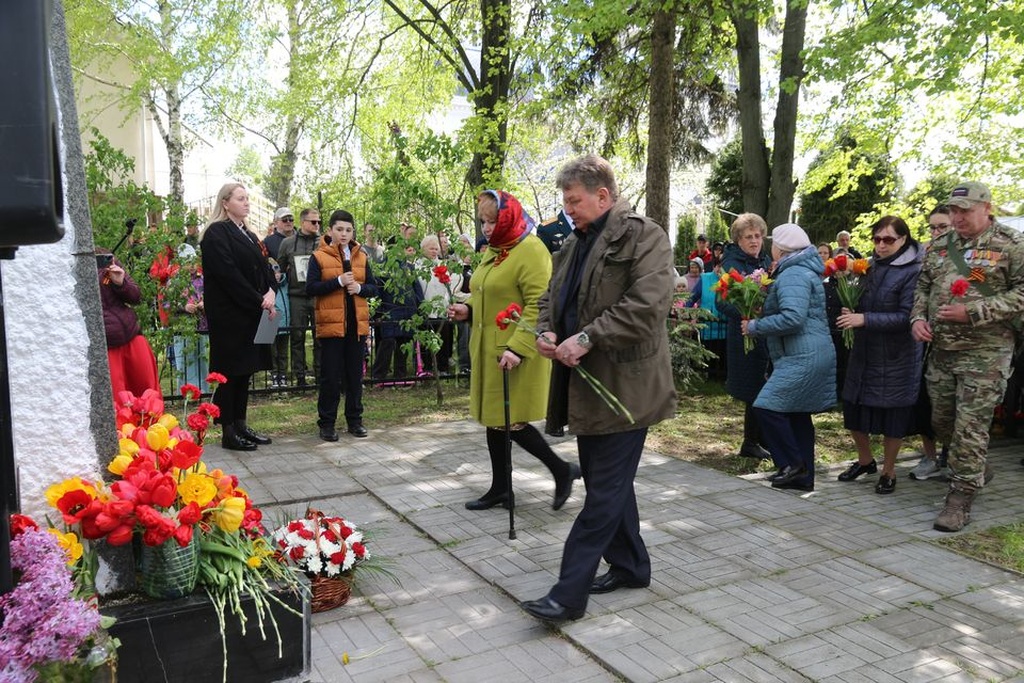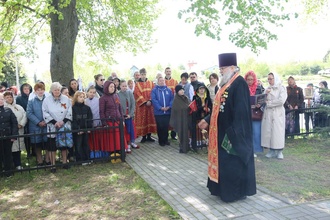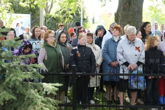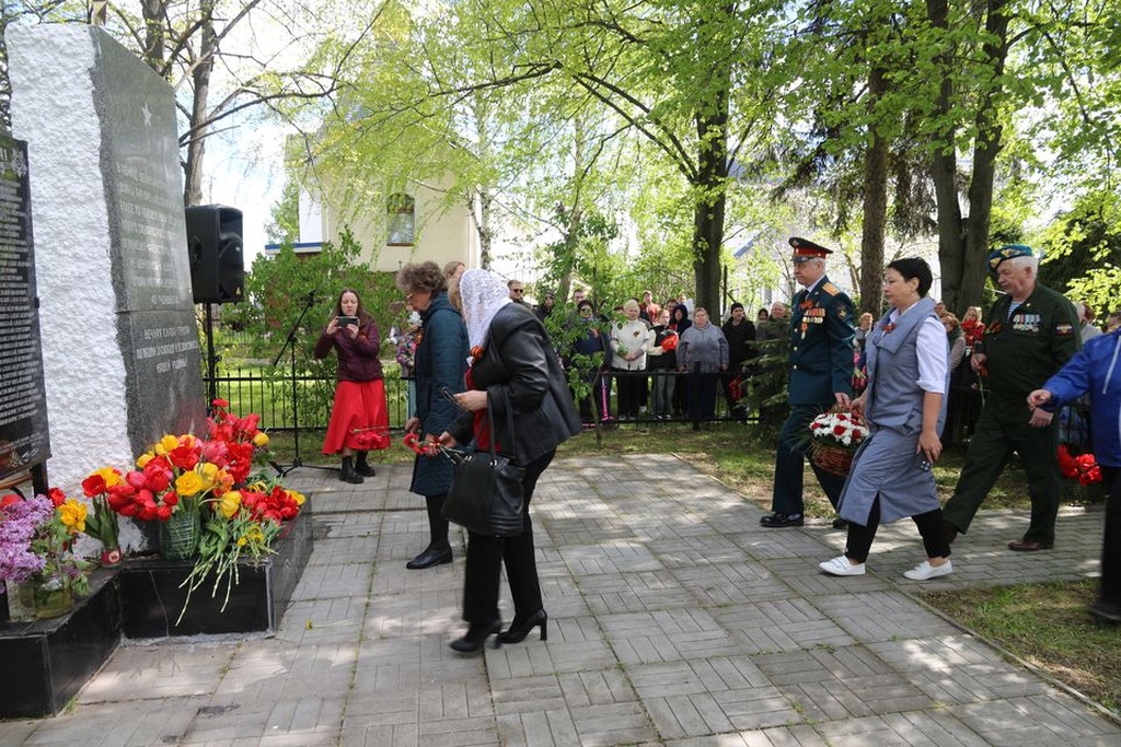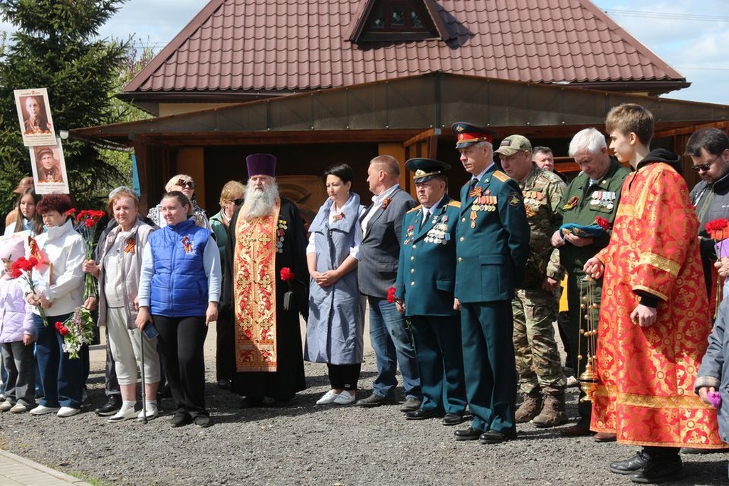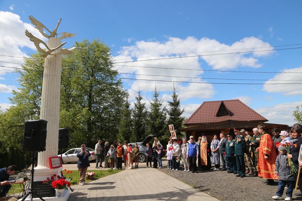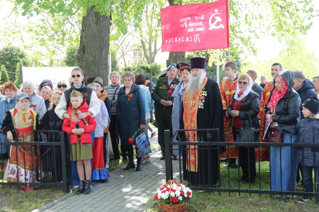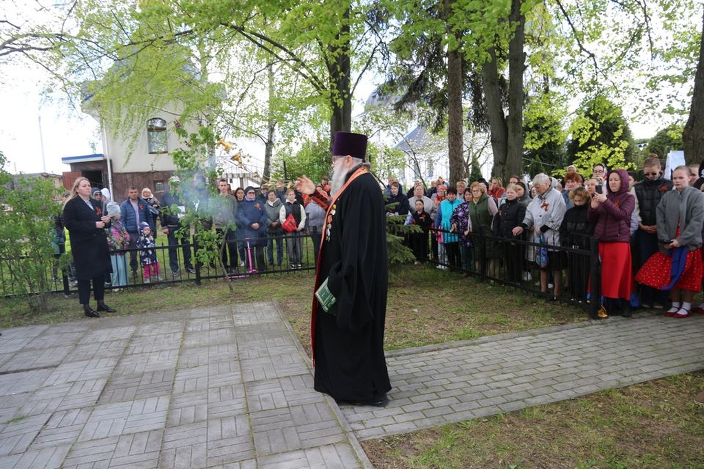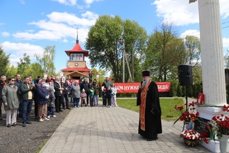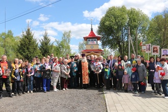 Представители администрации, прихожане храма и местные жители возложили цветы к памятнику, и почтили память павших на дорогах войны минутой молчания. По традиции на территории храма были установлены уличные стенды отражающие важнейшую роль Русской Православной Церкви в противостоянии нашего Отечества нацистской Германии.